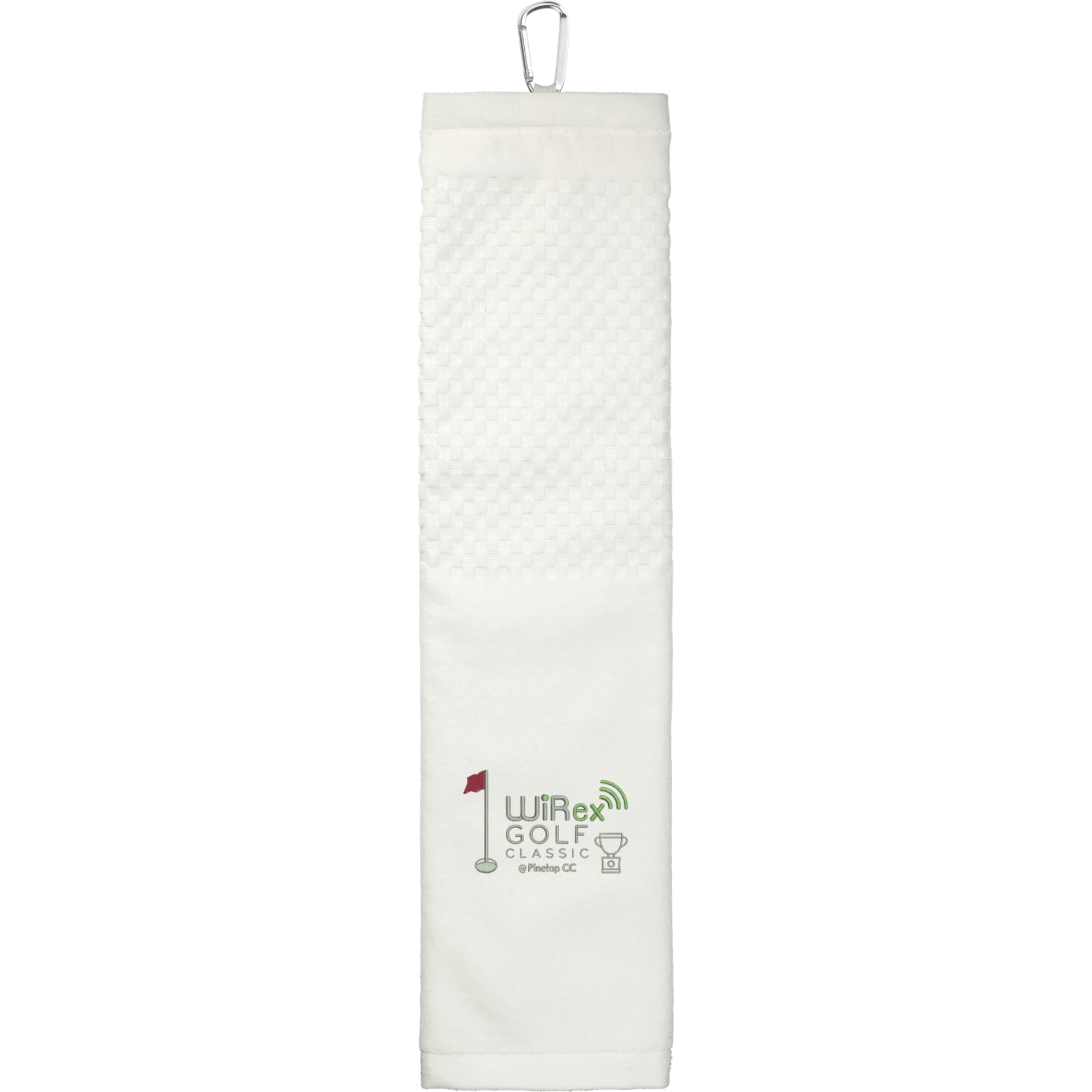 This heavyweight 3.5lb/dozen golf towel is 100% cotton and has a tri-folded design for scrubbing your golf balls and clubs. Comes with a grommet and aluminum carabiner clip for attaching to your golf bag. Free embroidery run charges on up to 10,000 stitches.