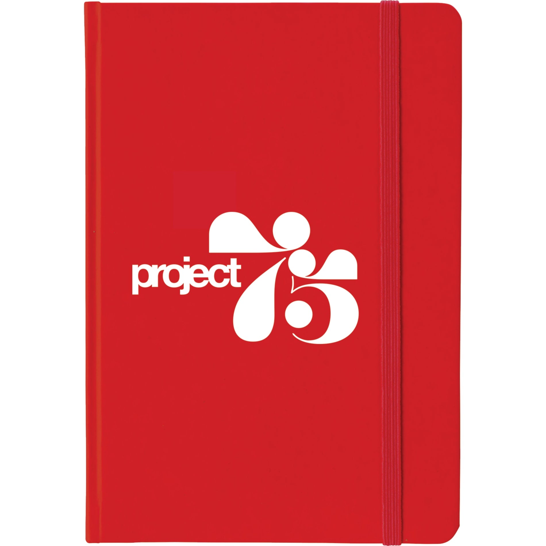 The 5in x 7in Large Rainbow Notebook includes an 80 white ruled page notebook with an elastic closure and a matching color ribbon bookmark. Hard cover.