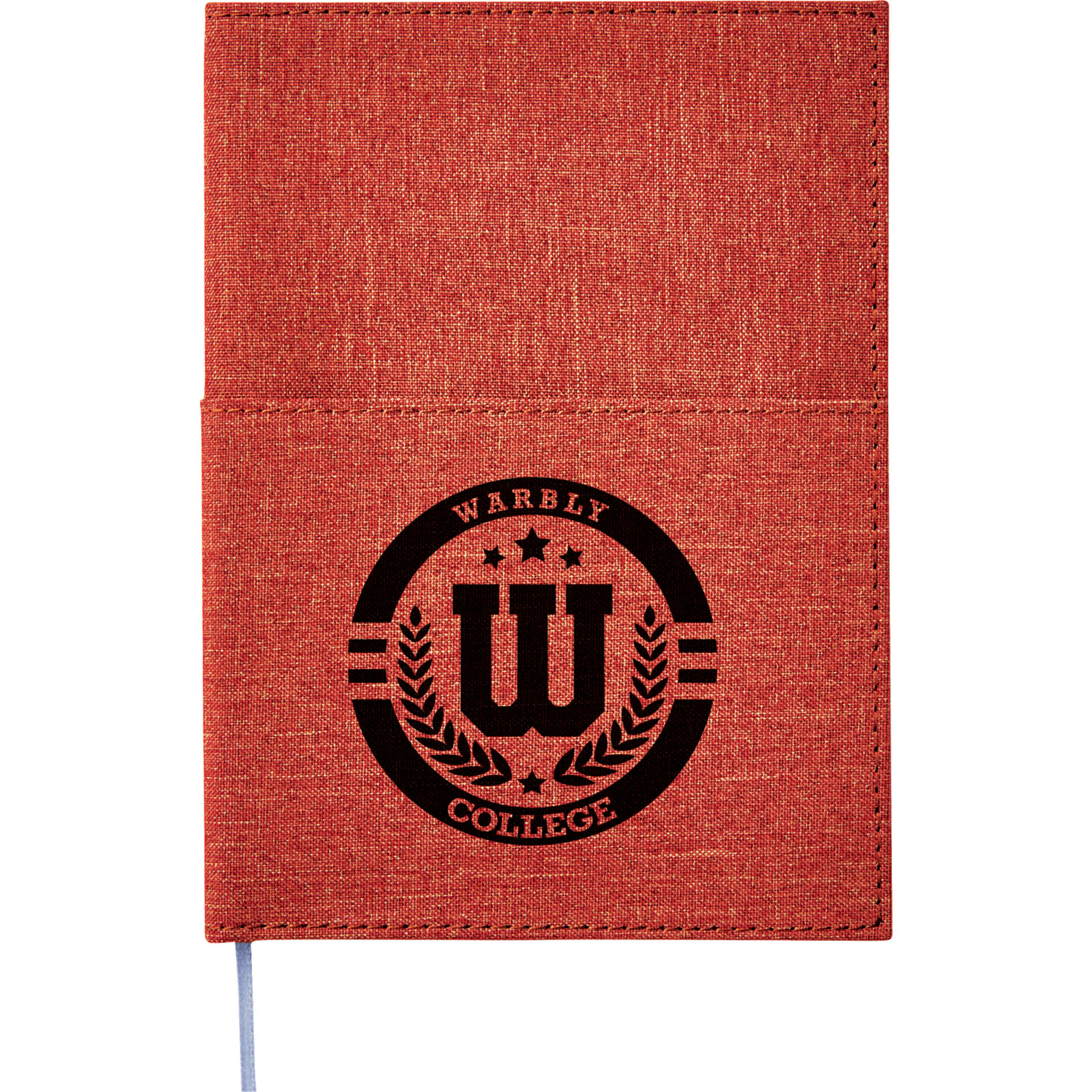 Canvas, refillable notebook with front and back pocket for storing business cards, smartphone, pens, etc. Ribbon page marker. 50 sheets of white lined paper. Hard, fabric cover.