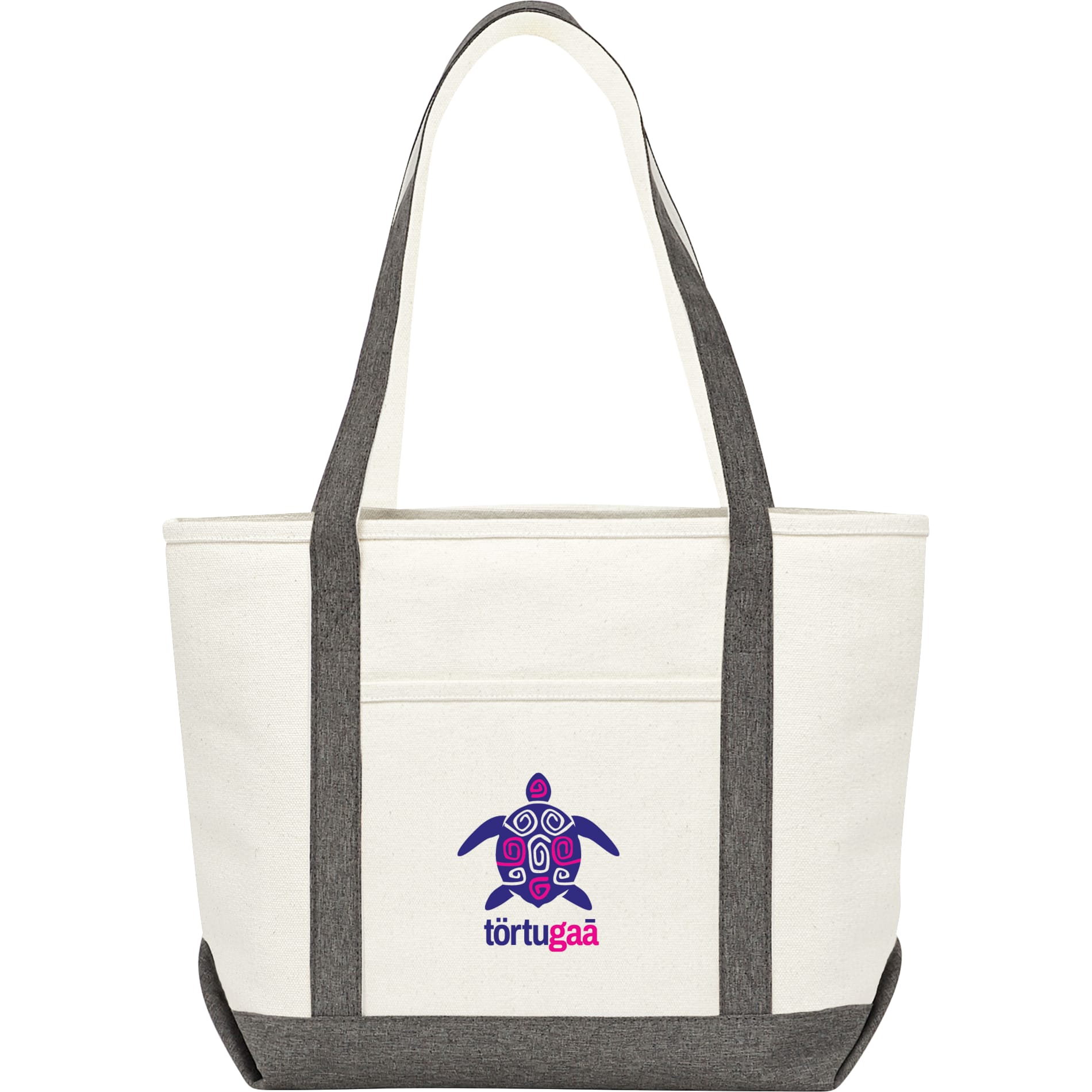 Great for outdoor events and travel. Classic boat tote shape in heavy weight and sturdy material. Open main compartment. Open front pocket. 12in handle drop height. Disclaimer: There may be minor variations in shade of the main material due to the nature of the fabric.