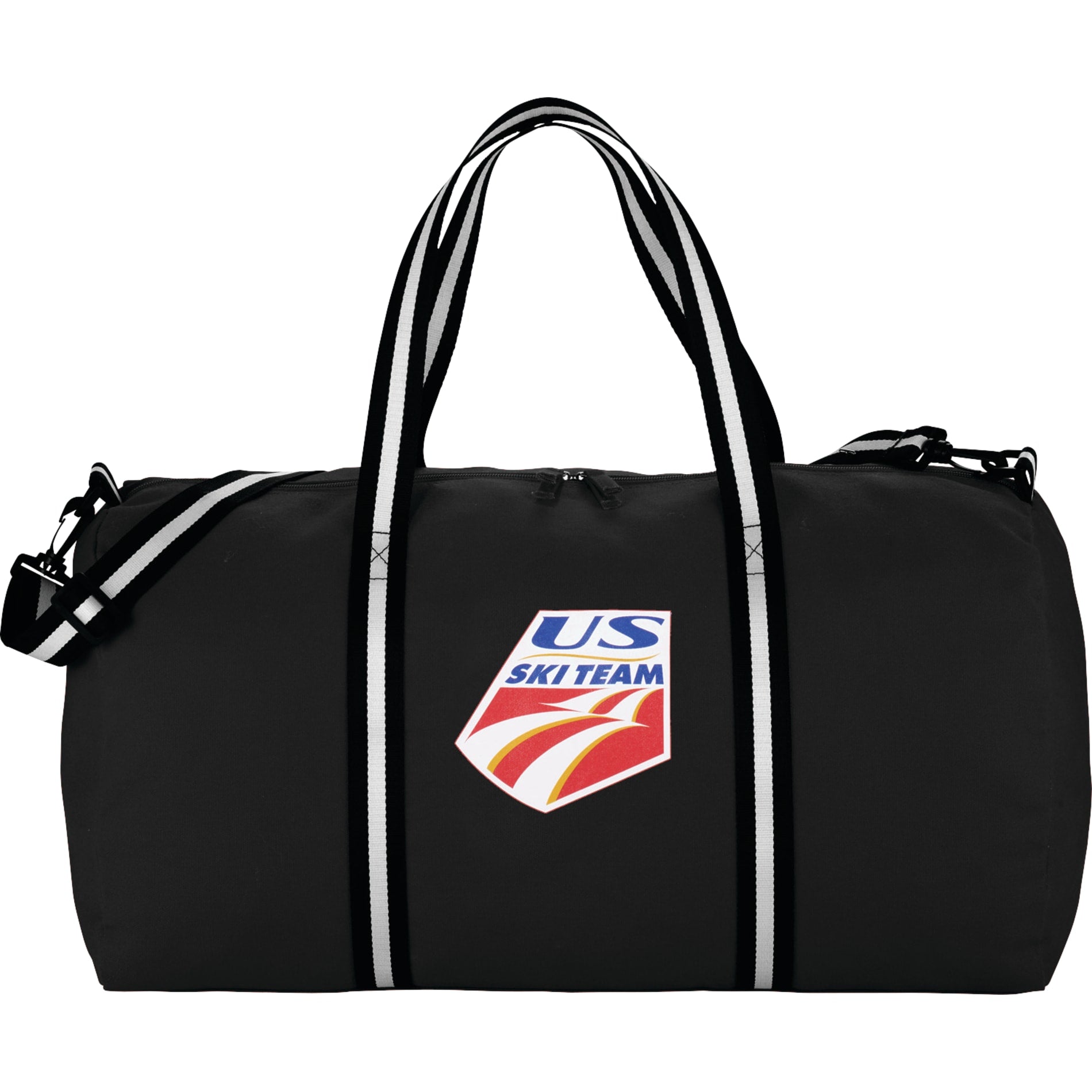 This iconic cotton weekender style is the perfect travel bag for your next adventure. Contrast stripe cotton webbing gives this classic a fresh look. Large zippered main compartment will hold all your clothes and gear. Detachable, adjustable striped cotton shoulder strap.