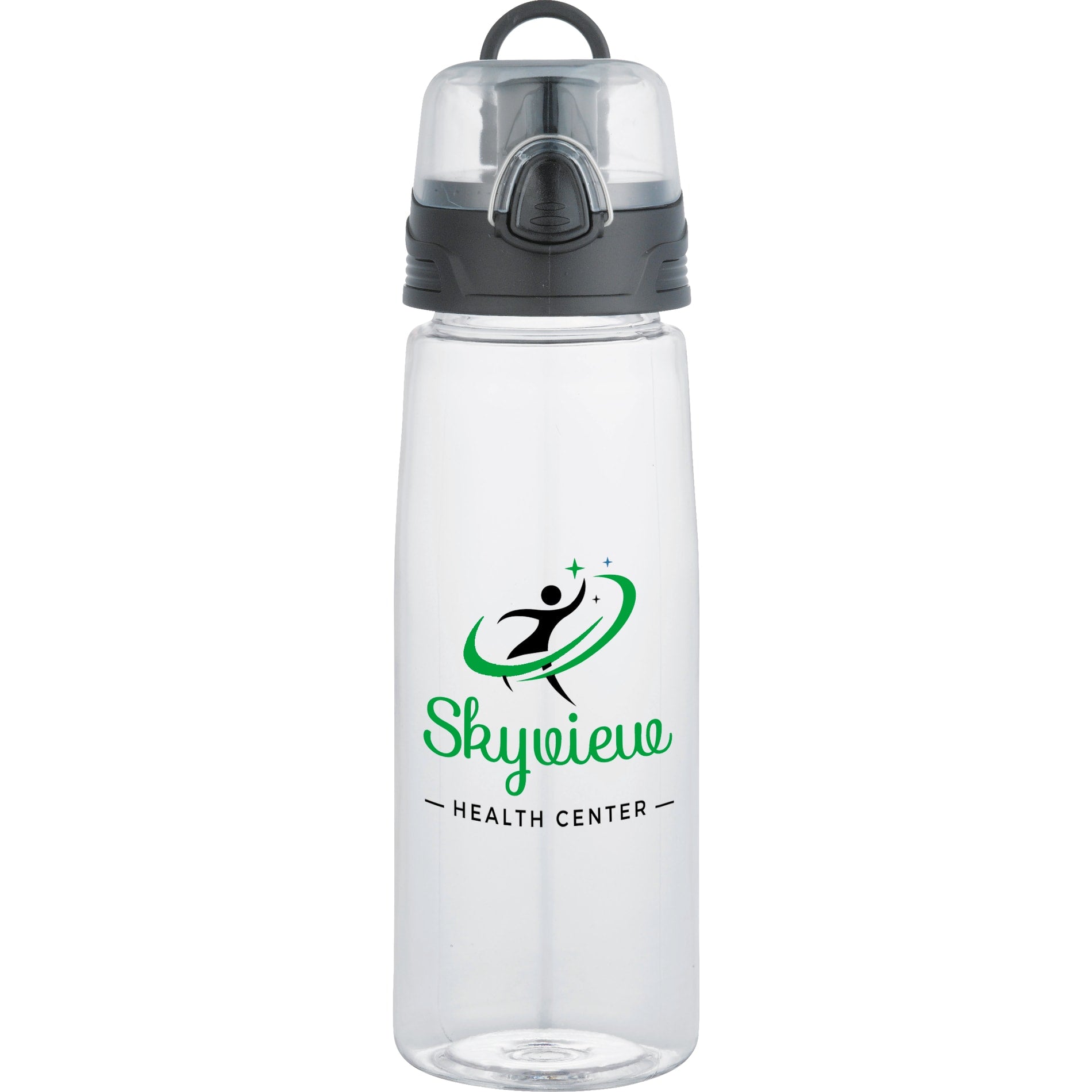 The Capri 25oz Tritan™ Sports Bottle features single-wall construction and a press-button, flip-open drinking lid with a spout. It also includes a metal locking latch and a plastic carry loop. Hand wash only and follow any included care guidelines.
