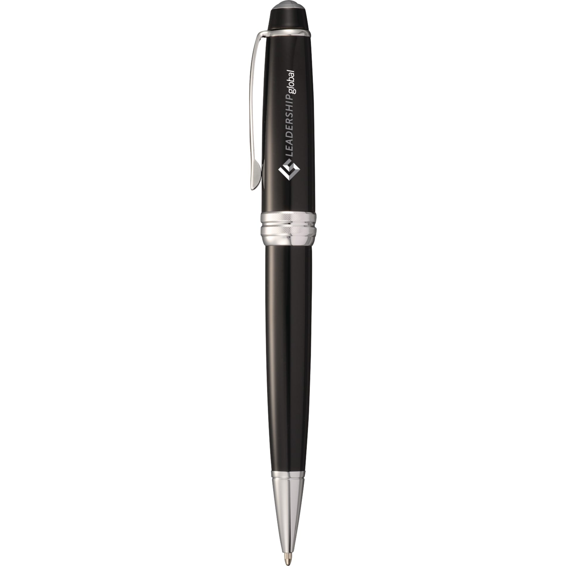 A simple articulation of modern Cross design, this elegant writing instrument features a traditional well-balanced profile in a selection of sophisticated finishes. A multi-grooved center ring with deep-cut engraved accents adds just the right amount of flair. Black lacquer finish with polished chrome appointments. Patented twist action propel/repel feature. Specially formulated ballpoint ink for a superior writing experience. Includes Cross gift box and limited mechanical guarantee. Medium pen tip size. Black ink.