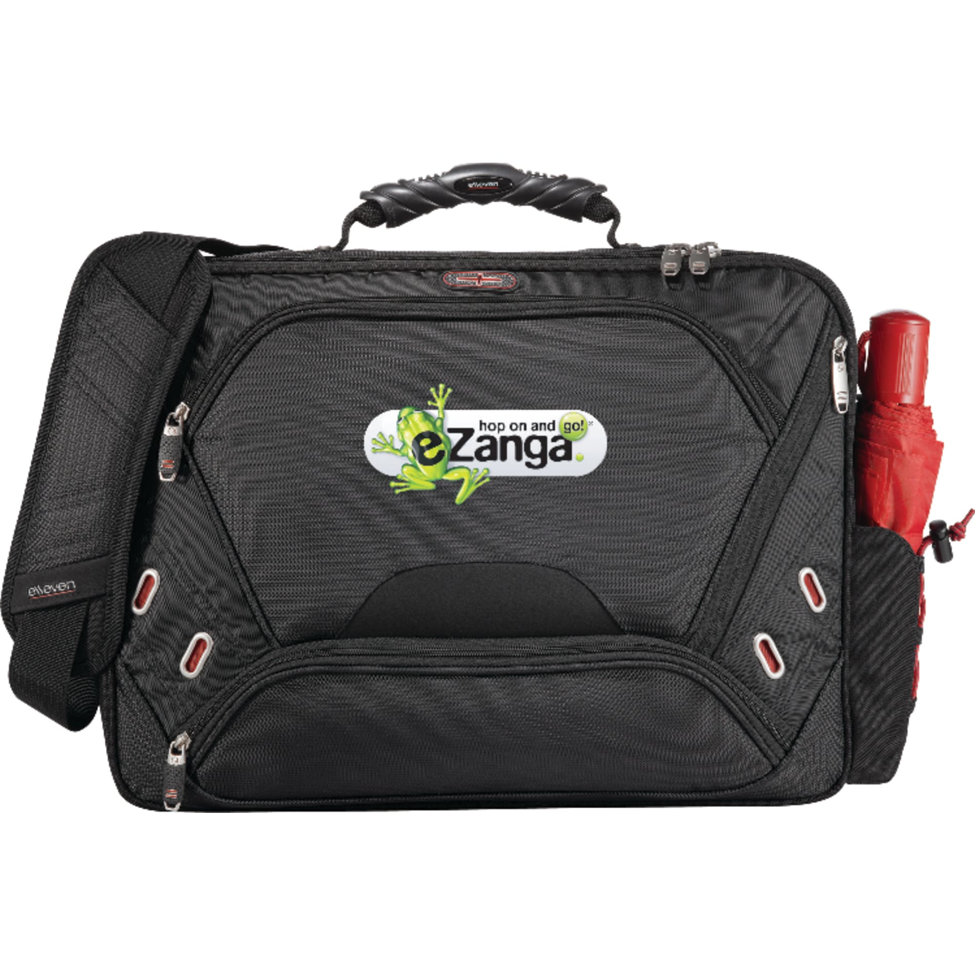 Includes designated laptop-only section that unfolds to lay flat on the X-ray belt to increase your speed through security. Back zippered compartment holds up to 17in laptops and has separate zippered pocket. Main zippered compartment for file dividers and mesh pocket organization. Front zippered pocket holds the removable techtrap elastic organizer panel, media pocket with earbud port and deluxe organization. Front lower and hidden pockets for valuables. Elastic shock cord on exterior side pocket for additional storage. Molded handle and padded, detachable, adjustable shoulder strap. Back panel designed to slip over trolley handles. Exterior TSA hangtag for guideline information. Signature elleven lining and hardware. Free run charges for embroidery up to 10,000 stitches.
