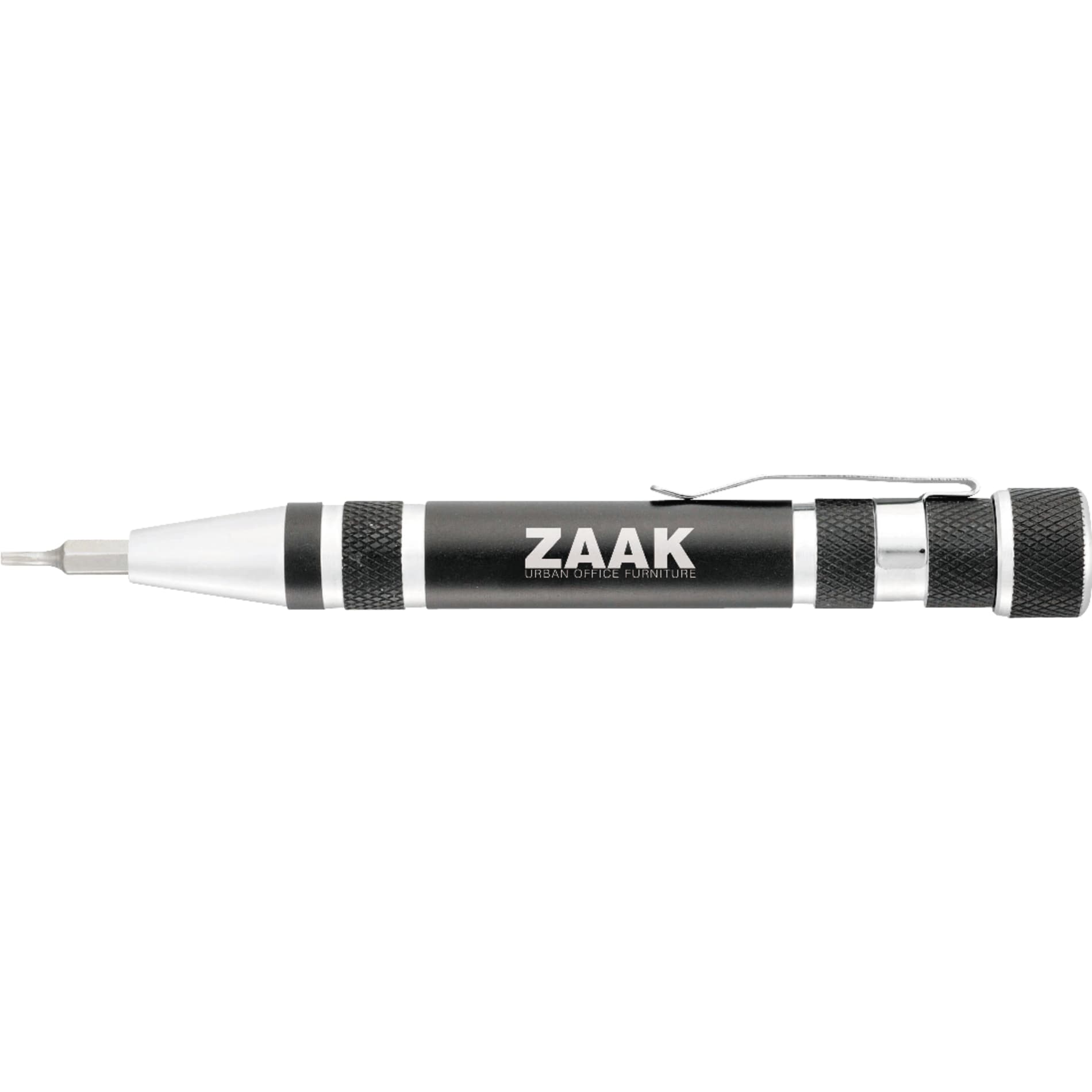 The Engineer Multi-Tool includes 2 Phillips bits, 3 star head bits, 1 flathead bit, 1 bent flathead bit, and 1 spanner bit. It also includes a twist-off cap for bit storage, a magnetic base and a durable metal clip. Laser engraving is recommended.