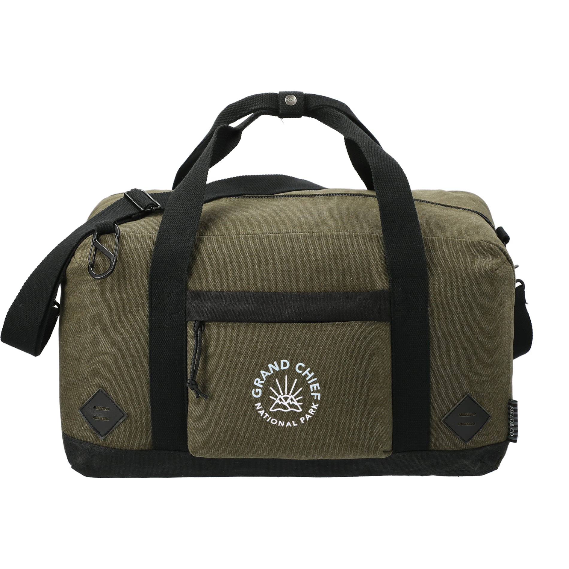 The Field & Co. Woodland Duffel is made from sturdy cotton canvas and features custom wood grain lining. This duffel includes a removable carabiner to hold your keys or favorite camp mug. It has a spacious zippered main compartment, zippered front accessory pocket, and two premium diamond lash tabs for attaching additional carabiners. Carry this duffel using the removable, adjustable shoulder strap or the webbing grab handles. The bottom is a durable waxed cotton canvas and will have a distressed look due to the waxing process.