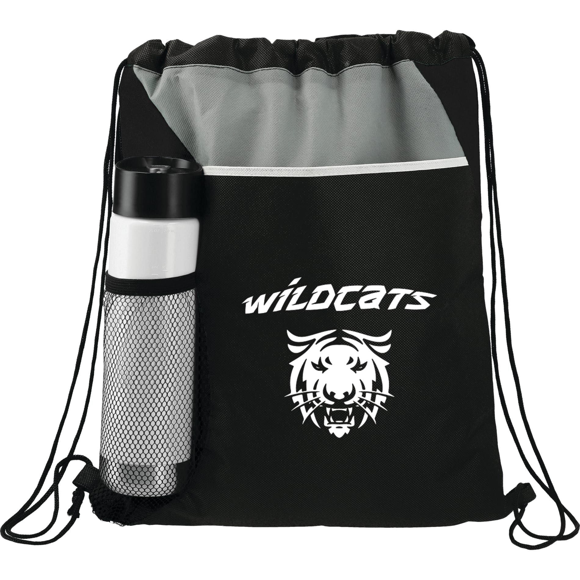 The Flare Drawstring Bag features an open compartment with cinching closure, as well as a front slash pocket and a handy mesh water bottle pocket.