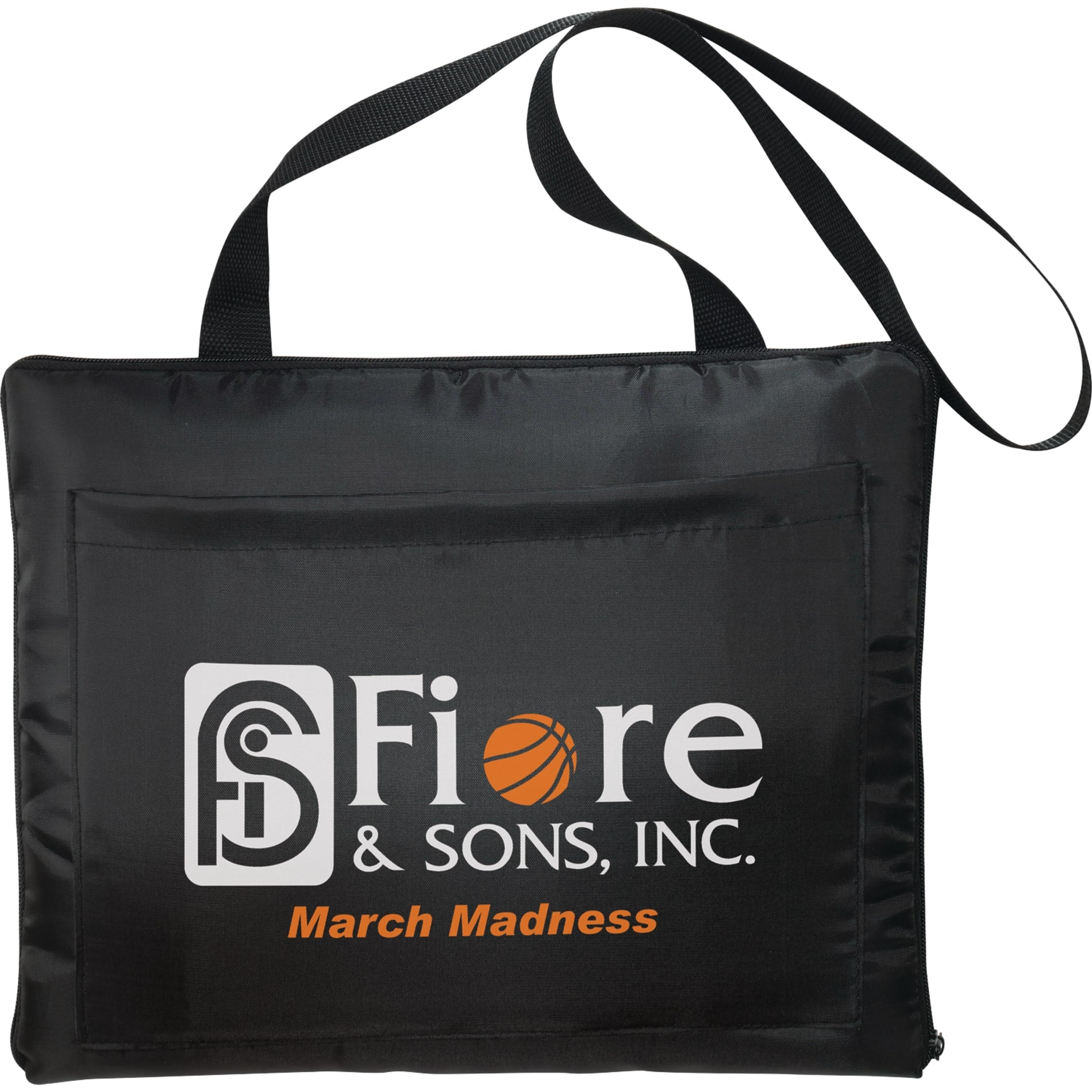 This perfect blanket can be used as a picnic blanket,seat cushion,or over your lap to keep warm while cheering on the big game. Easily folds into a convenient 13in x 11in tote bag with carrying straps and a 12in x 8.5in exterior pocket. The open dimensions are 50in x 60in. This blanket is spot clean only.