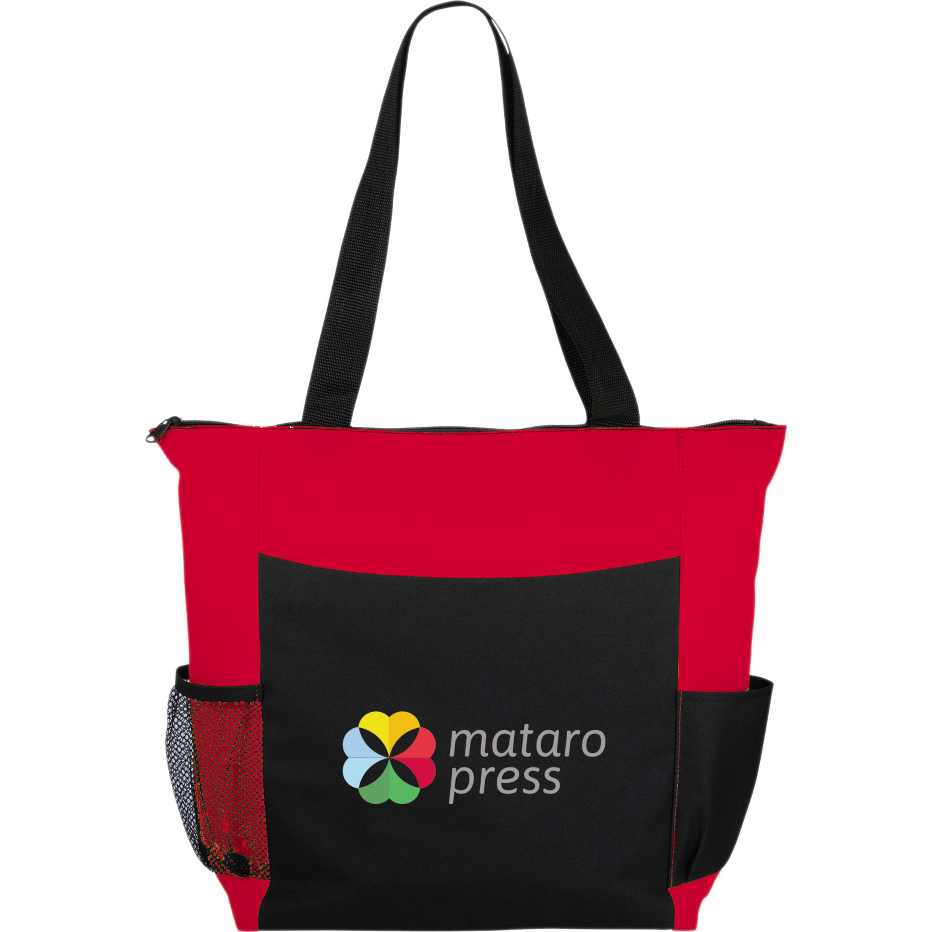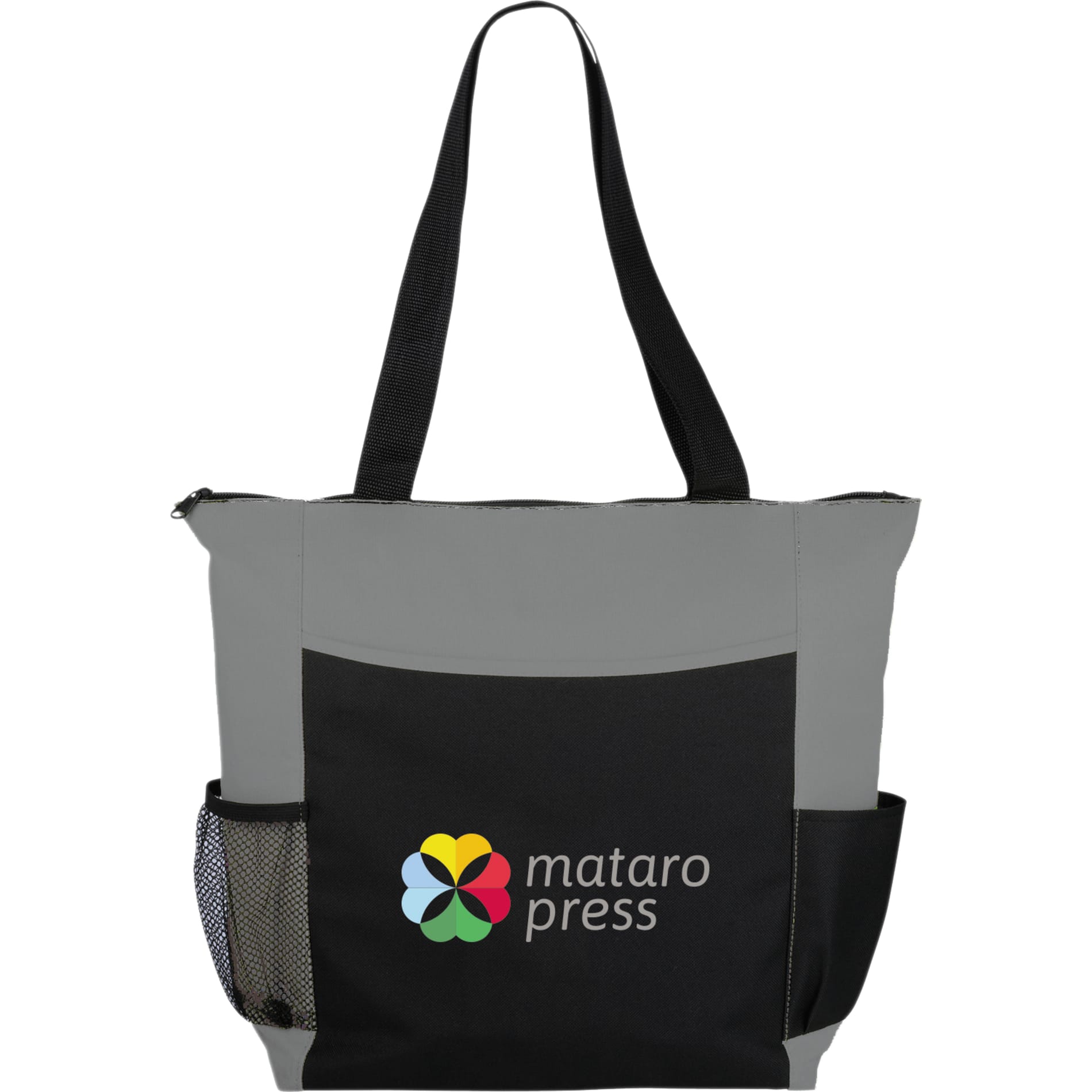 The Grandview Zippered Convention Tote has a large zippered main compartment with double 25 inch handles. This tote features an open front pocket, a side mesh pocket and a regular side pocket.