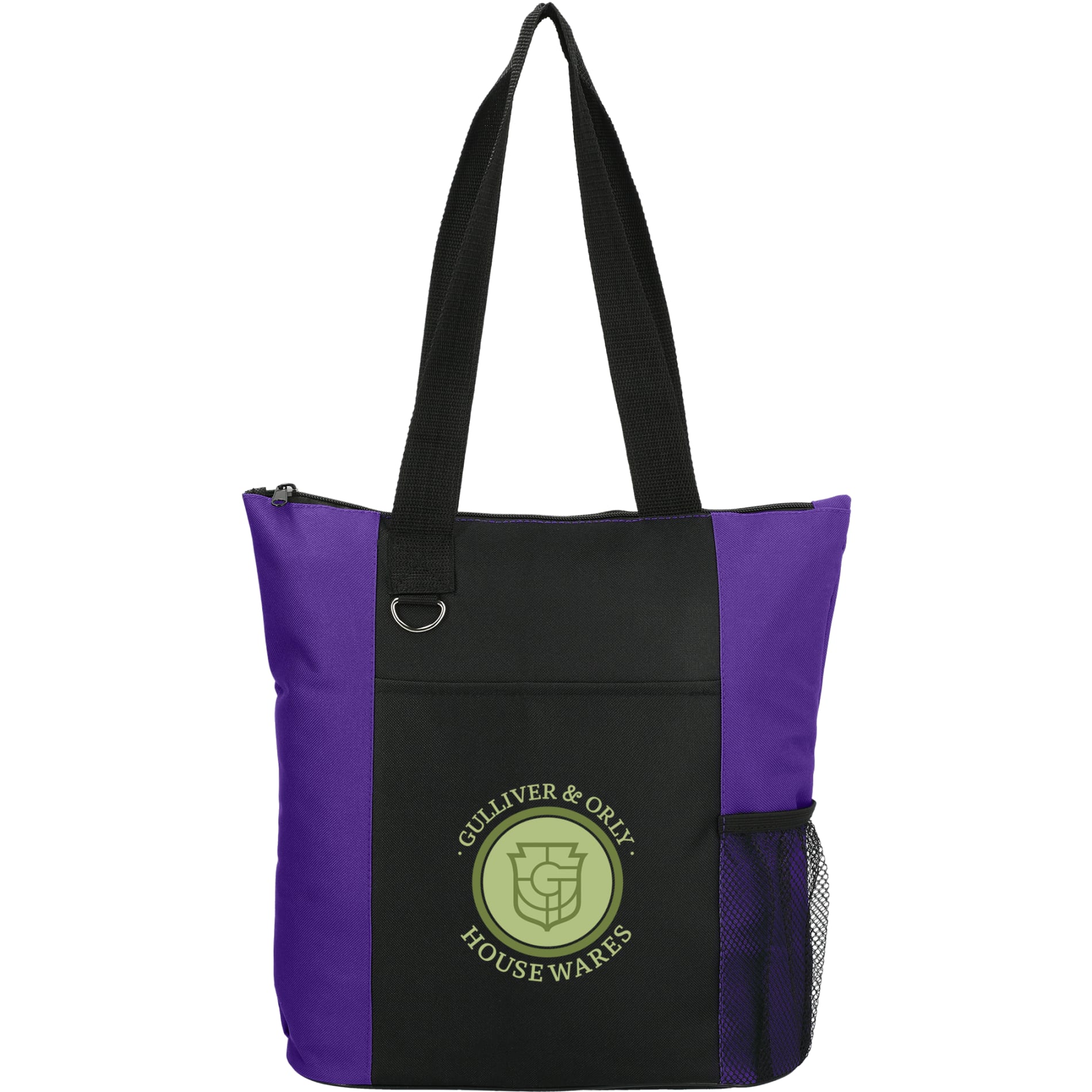 The Infinity Convention Tote has a zippered main compartment with a 11.5in handle drop. It additionally features an open front pocket, key ring and a side mesh pocket. Bottom piping has been removed.