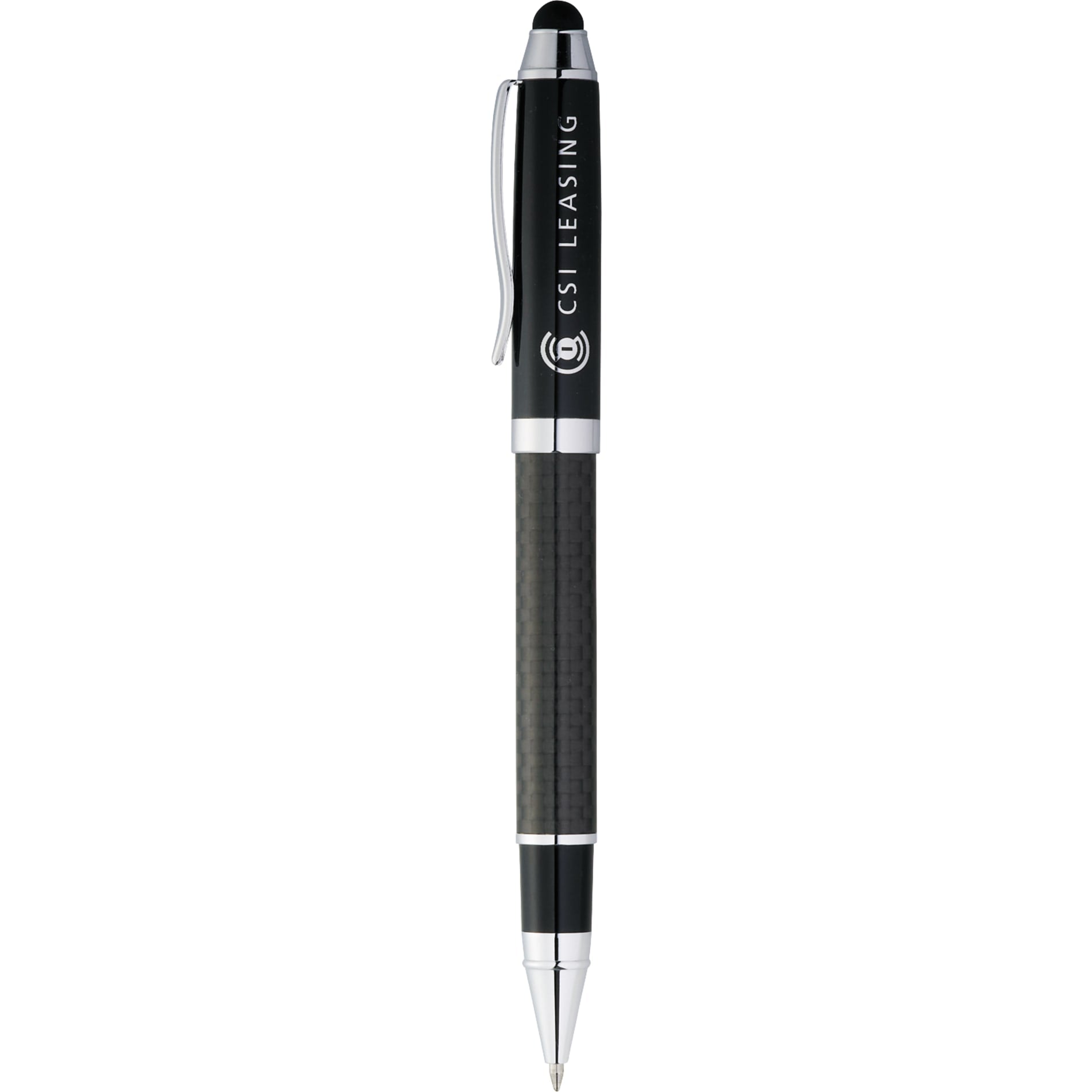 The Luna Roller Ball Stylus is constructed from brass and features a high-gloss black enamel upper barrel with carbon fiber detailing on its lower barrel. It has a cap-off design and includes a rubberized stylus tip ideal for all types of touchscreen devices, including iPhones, iPads, and retail payment pads, making your errands a breeze to complete. Laser finish is shiny chrome.