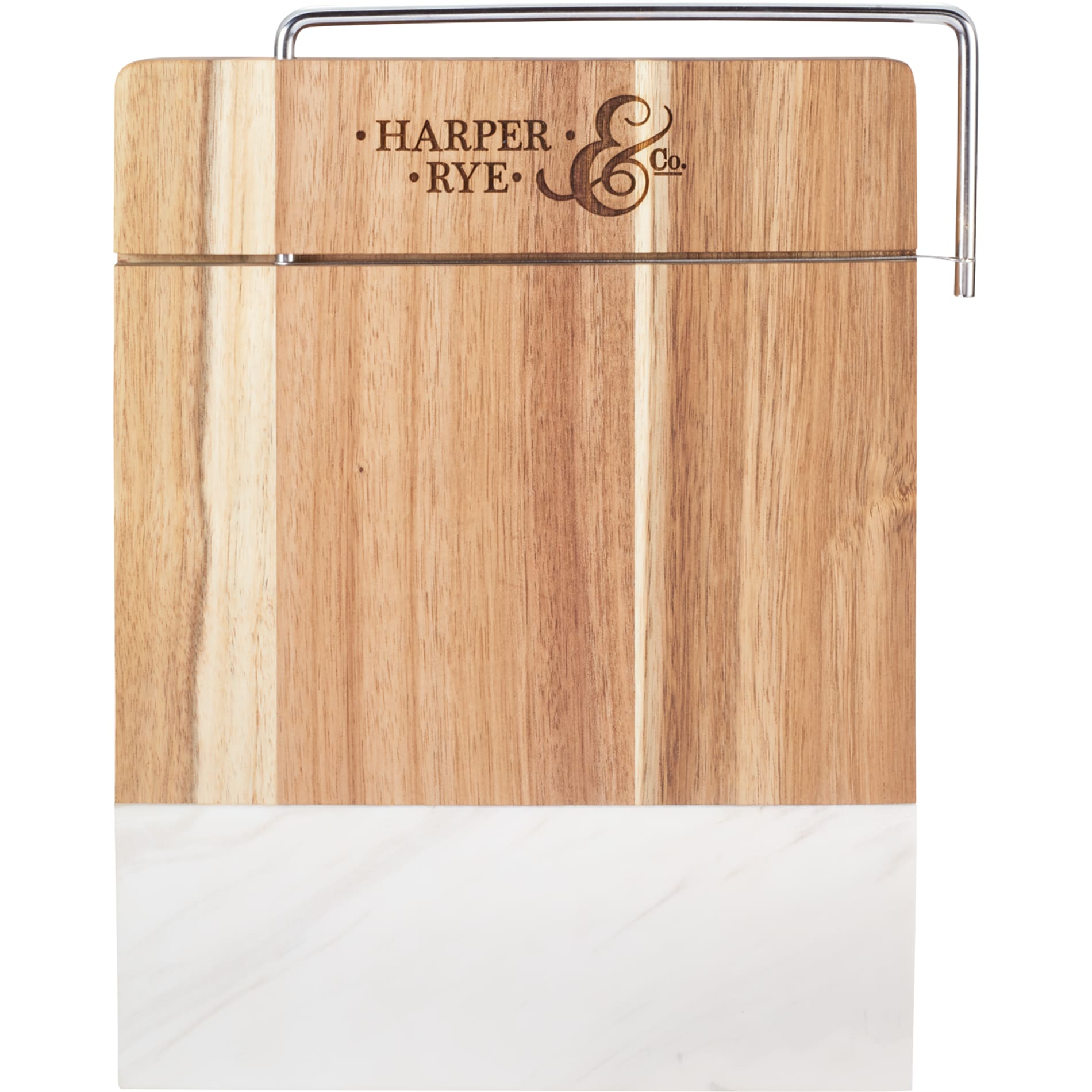 This sleek and elegant acacia wood and marble cheese cutting board with stainless steel handle and blade is perfect for entertaining at home. The on trend combination adds a touch of style and elegance to any party. Acacia wood measures 7.87in x 8.66in and marble measures 3.15in x 8.66in. Due to the nature of the materials variations in marble pattern and laser imprint will occur.