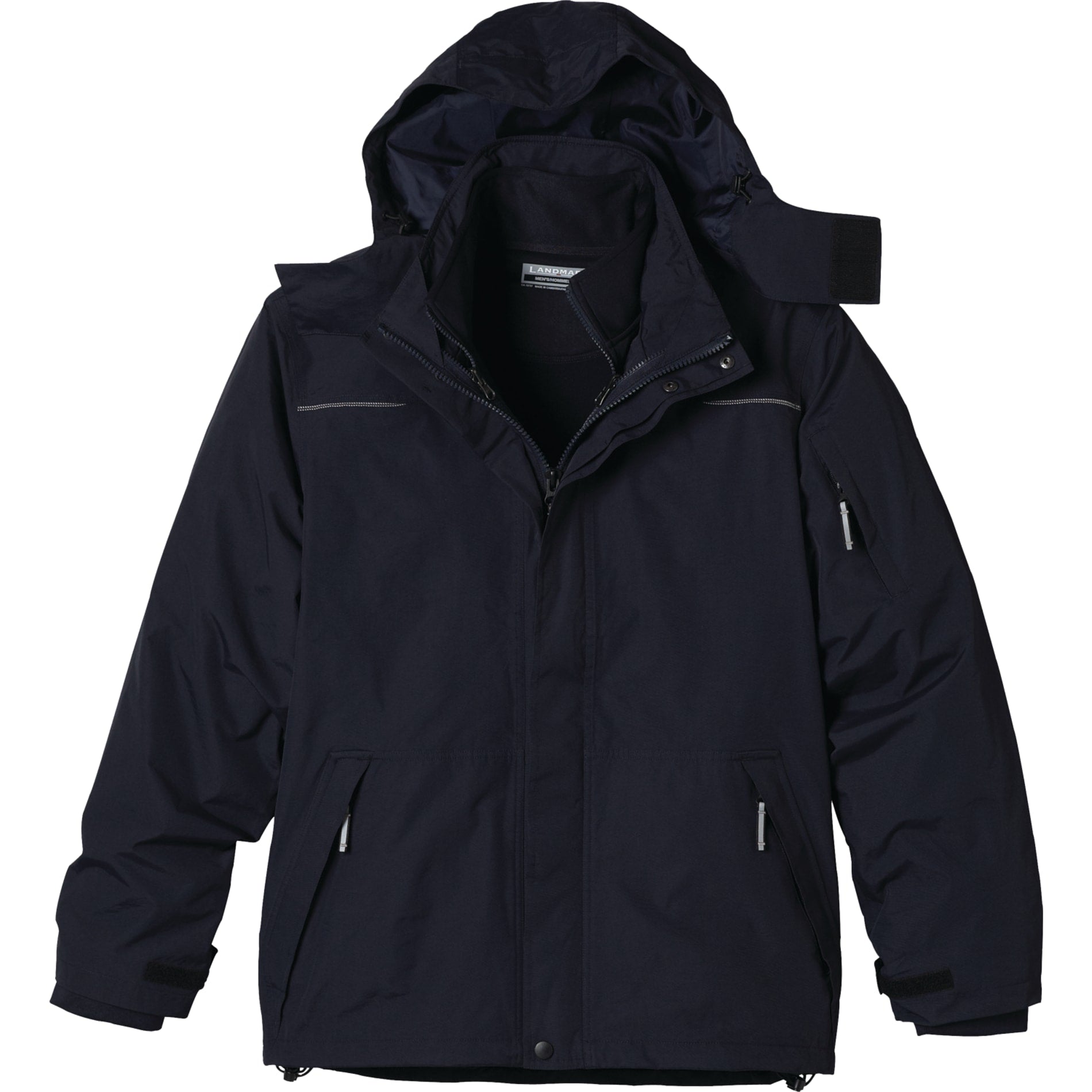 Seam sealed multi-functional 3-in-1 jacket with breathable, water repellant finish features detachable snap-off hood with drawcord and interior cord locks. Fine detailing includes diminishing two-tone reflective piping and triple needle top stitching. Sleeves engineered with adjustable self fabric cuff tabs with velcro closure and articulated elbows. With interior system snap tabs for liner add in. Accompanying liner with coverstitch detail features exposed plastic zipper with oxidise dark slider and puller. Lower patch pockets plus interior pocket with velcro closure. System loops at neck and lower sleeves.