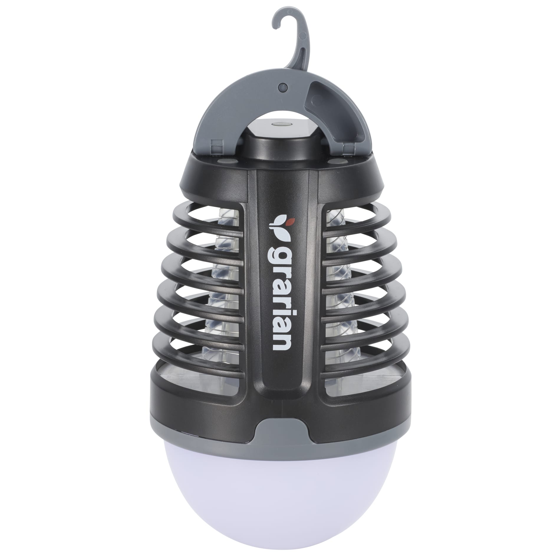 Keep the pesky bugs away with the Mosquito Repellent Night Lamp. The lamp features a bottom light, a bug zapping light, and a hanging hook. The both lights are activated by touch on the top of the lamp. The bottom bulb is a bright LED light comparable to a filament bulb. The blue light in the center surrounded by a safe guard has a special wavelength that attracts insects to the inner grid that shocks them with 2000V of electricity. They then fall to the inner space of the lamp there they can be swept away with the included brush. Perfect for all outdoor areas, the Mosquito Repellant Night Lamp is rechargeable by USB. One 18650 lithium battery included.