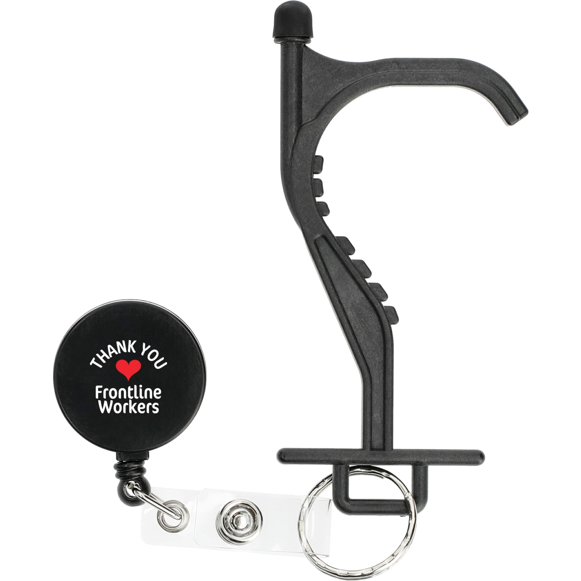 Your must-have work accessory will be the No Contact Keychain. This keychain tool helps to avoid contact with dirty, contaminated surfaces. This multi-purpose tool can be used when opening doors, pressing buttons, using the ATM, and carrying shopping bags. Made from reinforced nylon. Hook shape designed to grab a handle and open doors. Rubber stylus can be used on signature pads, ATMs, and cellphones or tablets. Retractable badge holder clip that extends 3ft for ease of use. Add this to your assortment of PPE. Note: Clear badge holder sleeve shown in image is not included. Decoration size is 1in diameter.