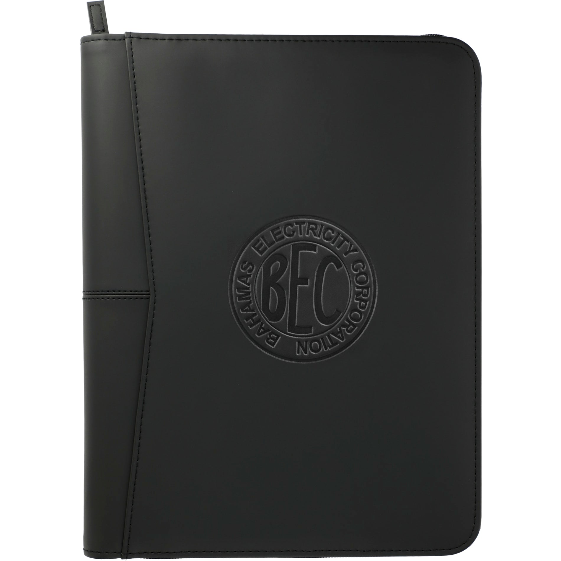 Zippered closure. Interior organizational panel features pen loop, USB memory pocket, gusseted multi-functional pocket, five business card pockets and a mesh ID window. File pocket. Features 1in metal three-ring binder. Includes 8.5in x 11in writing pad. Pen not included.