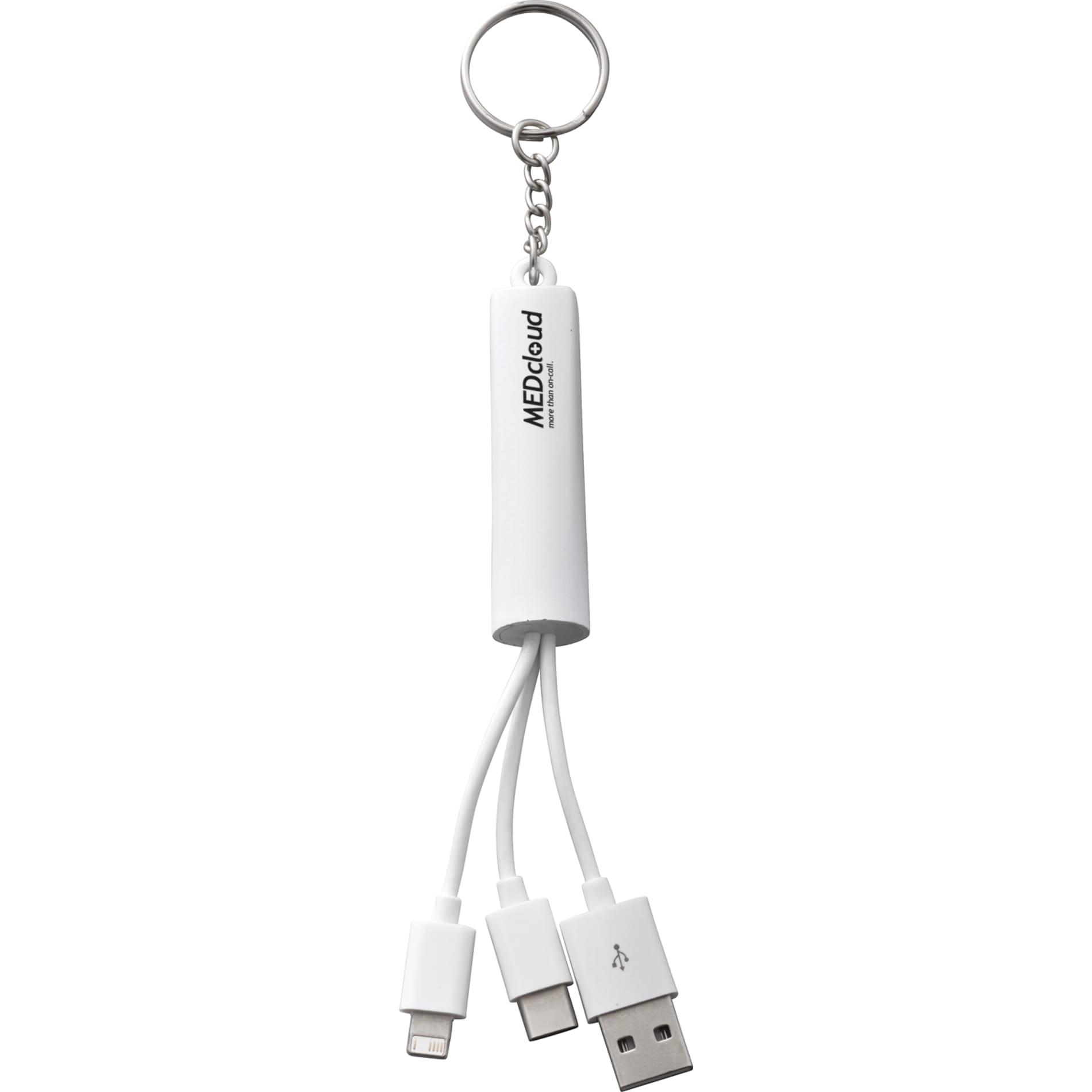The Route Light Up 3-in-1 Charging Cable features a USB A tip, USB Type C tip, and a 2-in-1 dual compatible tip for both Apple iOS and Android devices with 1A current. Not compatible with iPad Pro. It also comes with a key chain. This item must be lasered to reveal the light up function.