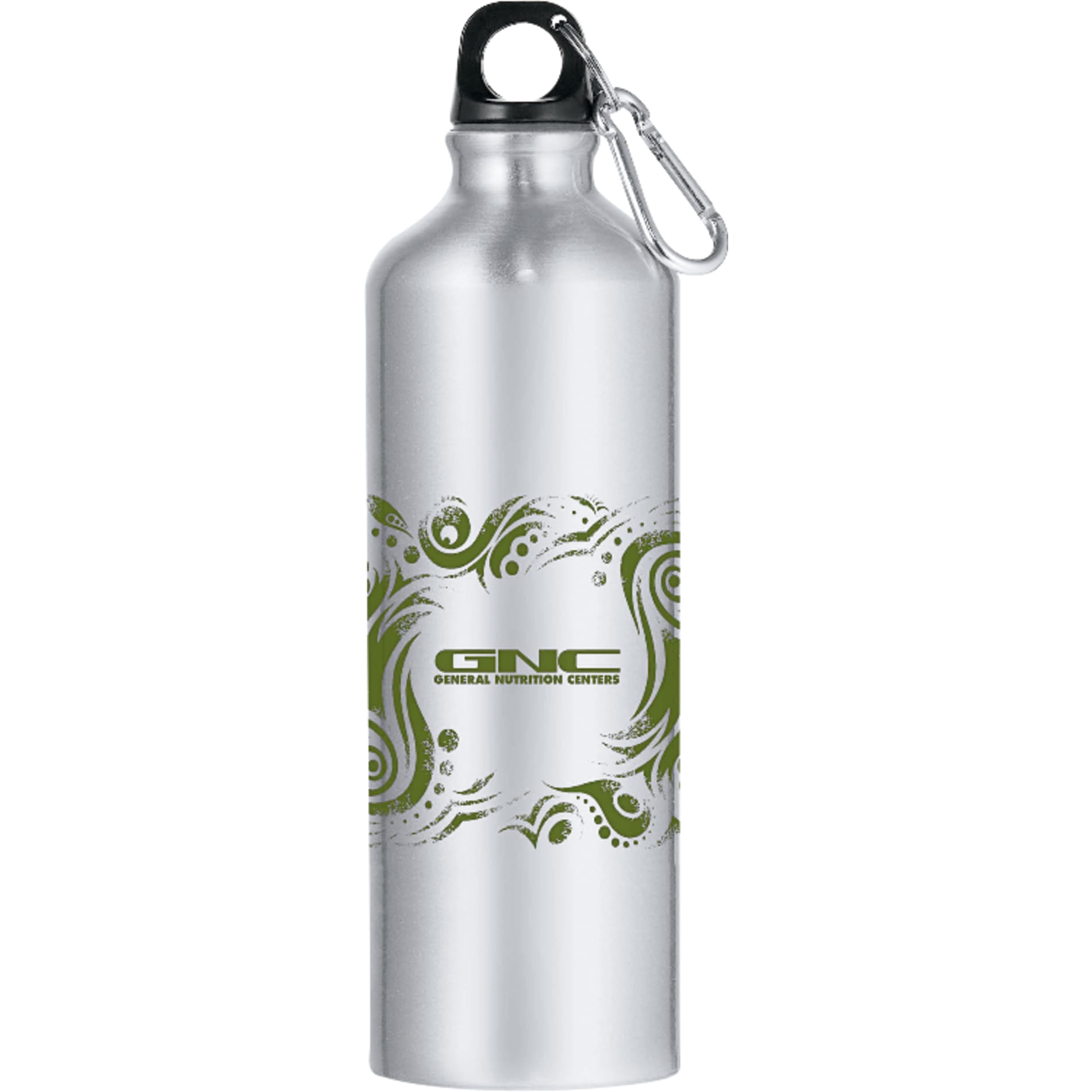Screw-on lid. Food grade internal liner. Includes matching carabiner. BPA free. 26 oz.