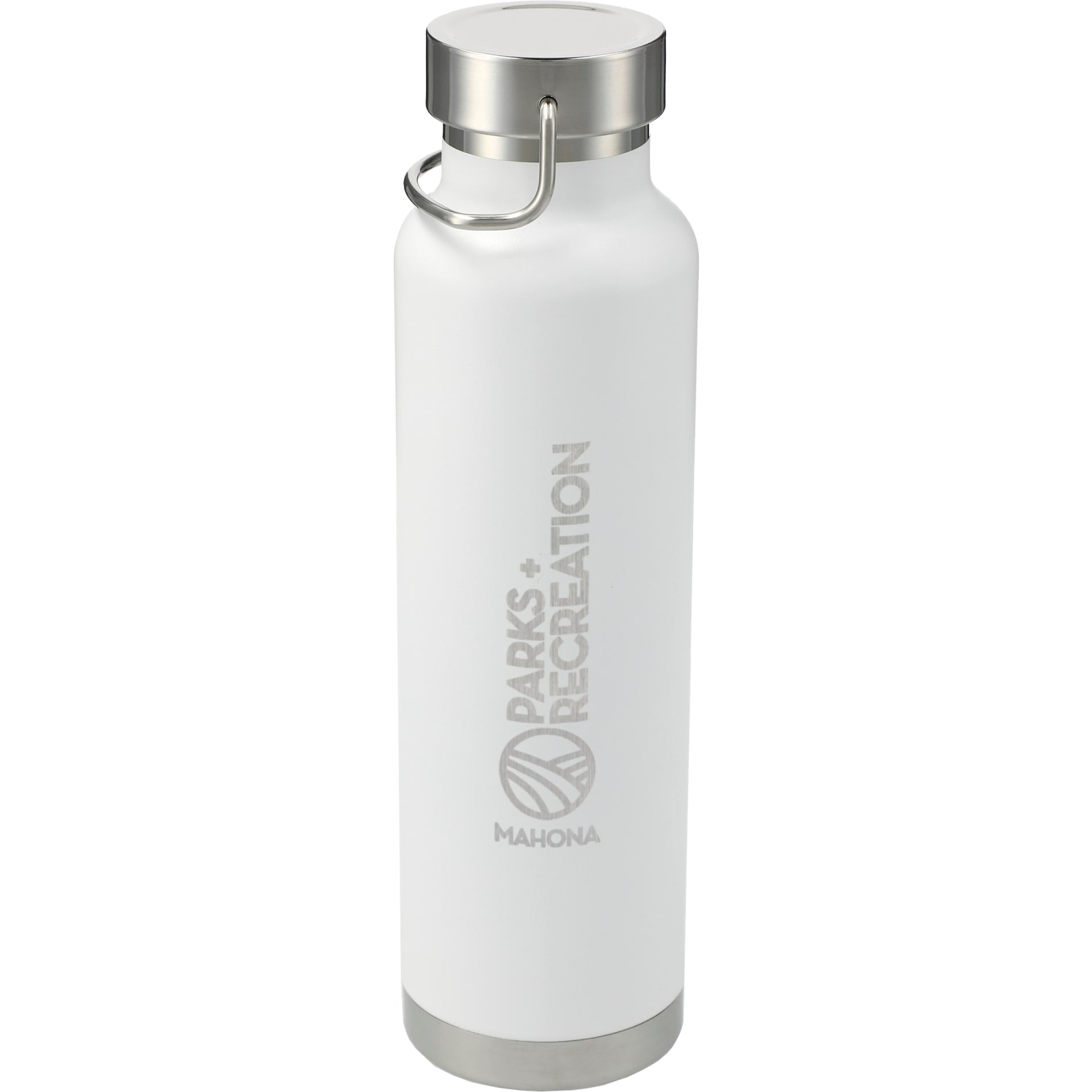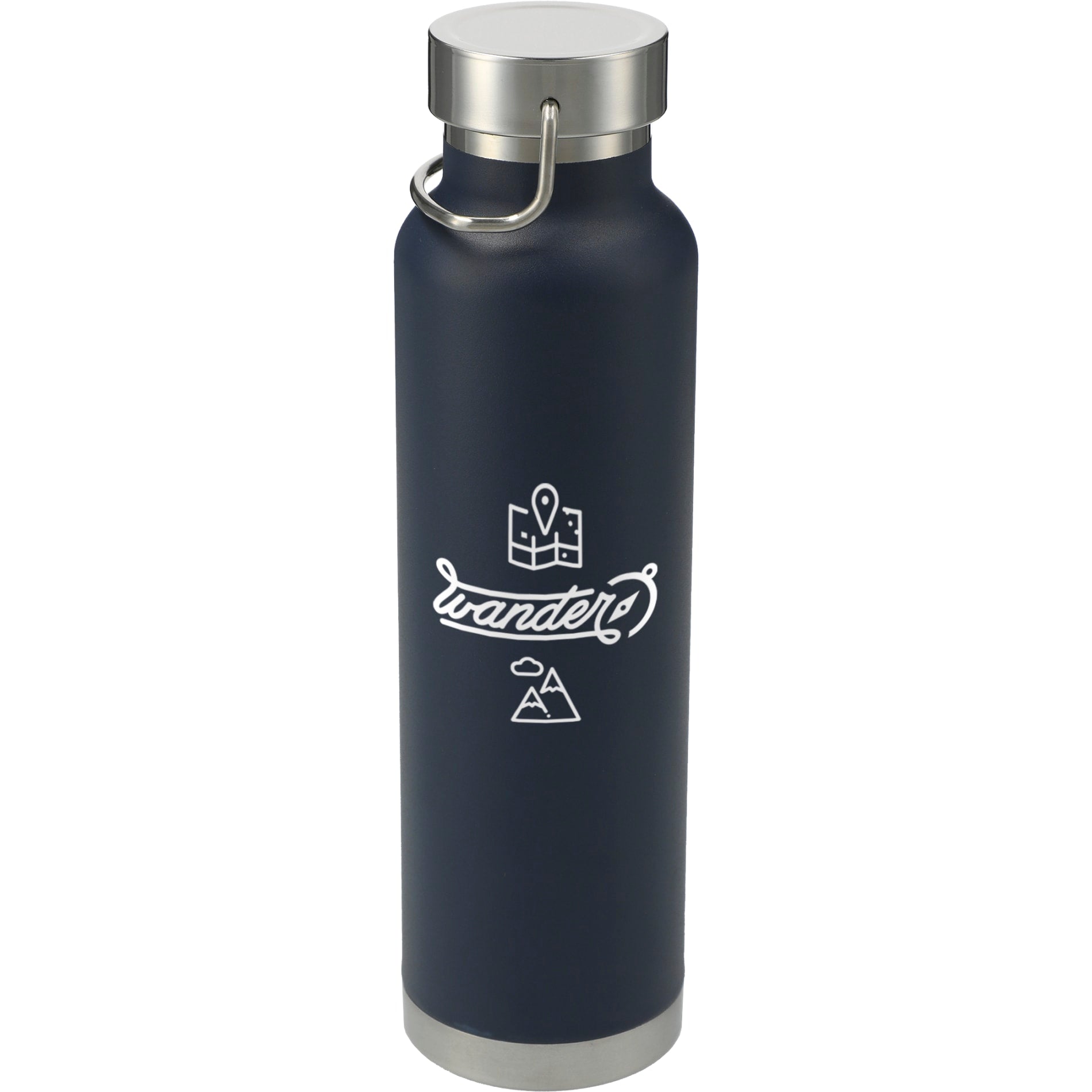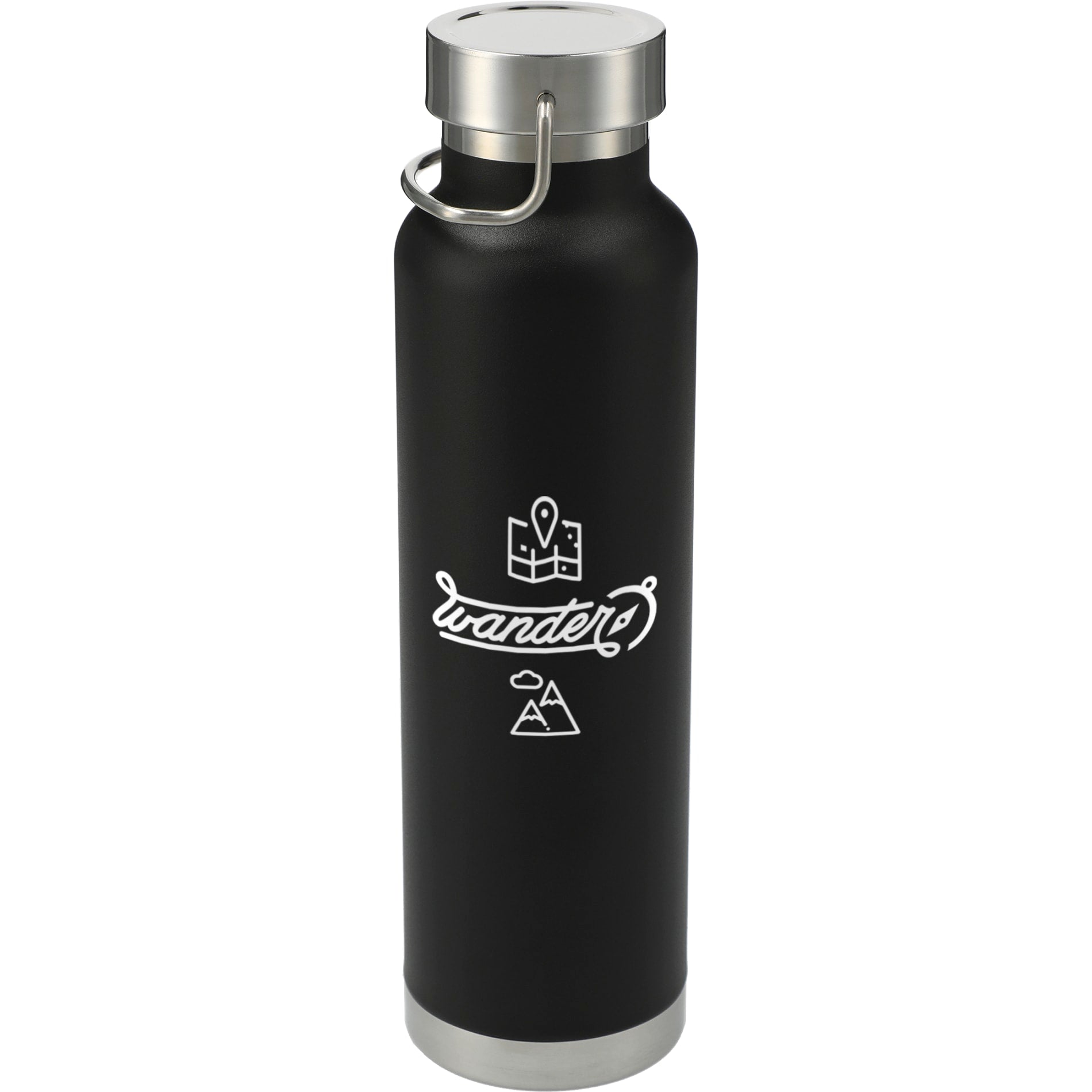 Durable, double-wall stainless steel vacuum construction with copper insulation, which allows your beverage to stay cold for 48 hours and hot for at least 12 hours. The construction also prevents condensation on the outside of the bottle. On-trend, durable powder coating. Stainless steel screw-on, spill resistant lid with durable stainless steel hand loop. Wide opening for comfortable filling and pouring. Perfect for ice cubes. Fits most standard car cup holders. 22oz.