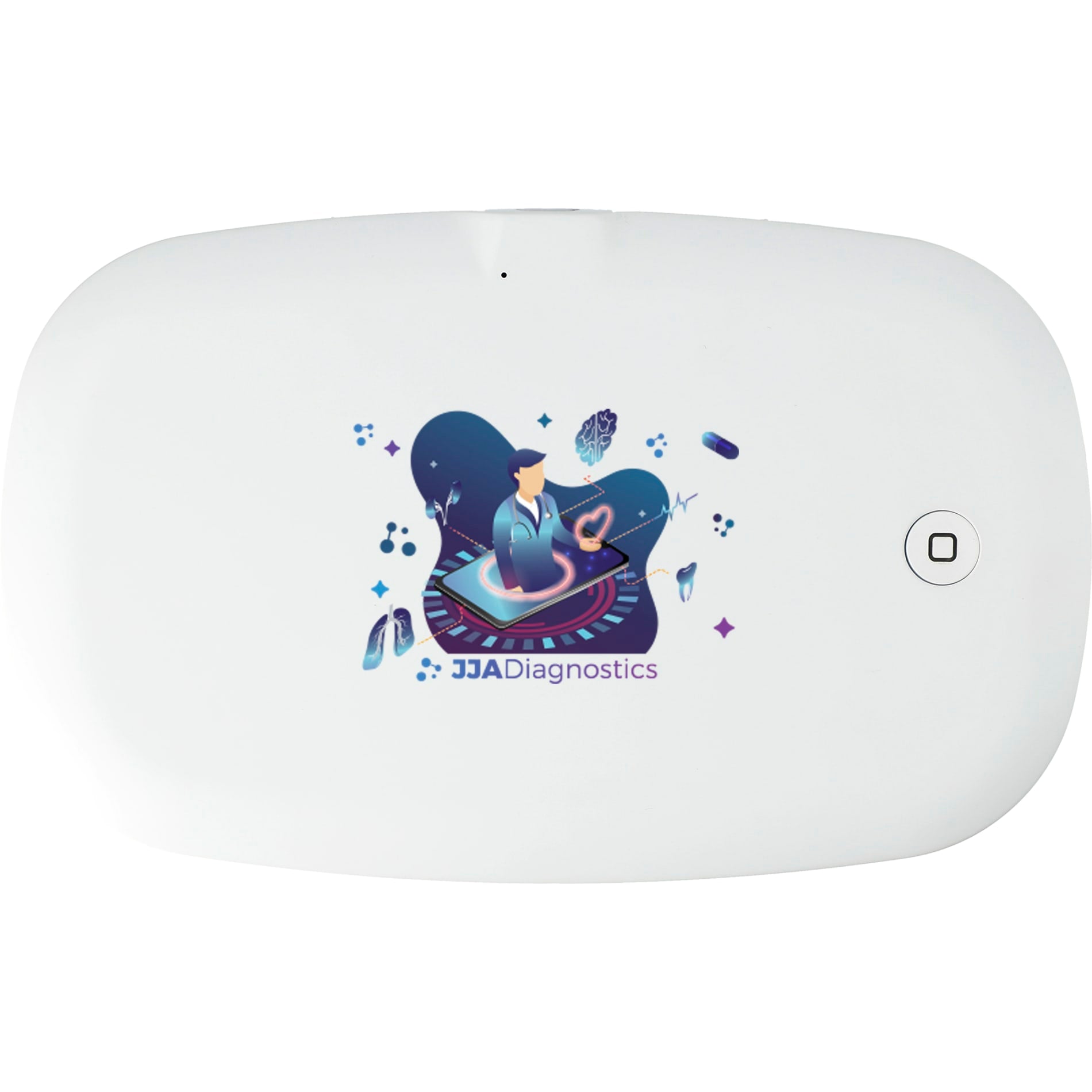 This UV Phone Sanitizer with Wireless Charging Pad uses UV-C light technology for sanitization to kill 99% of microorganisms tested. Two UV germicidal LEDs (270-280nm wavelength) are used for optimal sanitization. Press the button once for a short 90 second sanitization. Press the button twice for a 5-minute-deep clean sanitization. It can sanitize almost anything that fits inside (7.5in L * 4in W * 1in H) such as large phones (iPhone 12 Pro Max), keys, credit cards, watches, eyeglasses, jewelry, etc.. The sanitization will be stopped automatically once the lid is lifted to avoid UV light exposure. The wireless pad supports 5W wireless charging and works with most plastic phone cases. Includes a 39in USB to Type C charging cable. Available for shipment within the United States (including Alaska Hawaii & Puerto Rico). Not available for export.