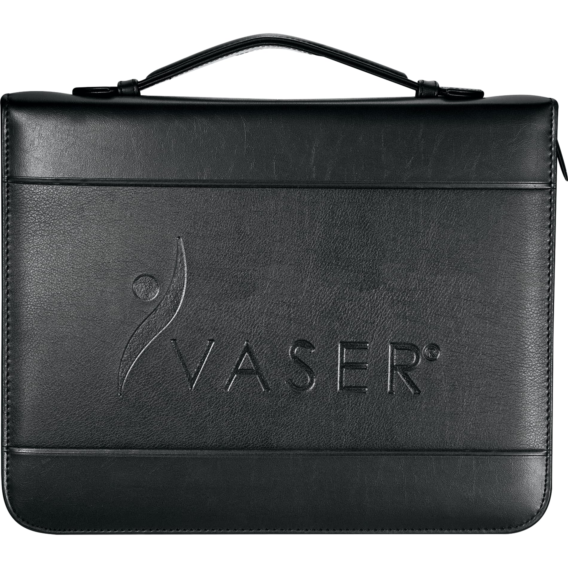 Zippered closure. Elastic pen loop. 2 document pockets. 2 business card holders. Interior organizer with 1in three-ring binder. Clear calendar management pocket that doubles as a page marker. Comes with undated calendar insert. Includes 8.5in x 11in writing pad. Refills available at leedsworldrefill. Refill item # 9091-01RF.