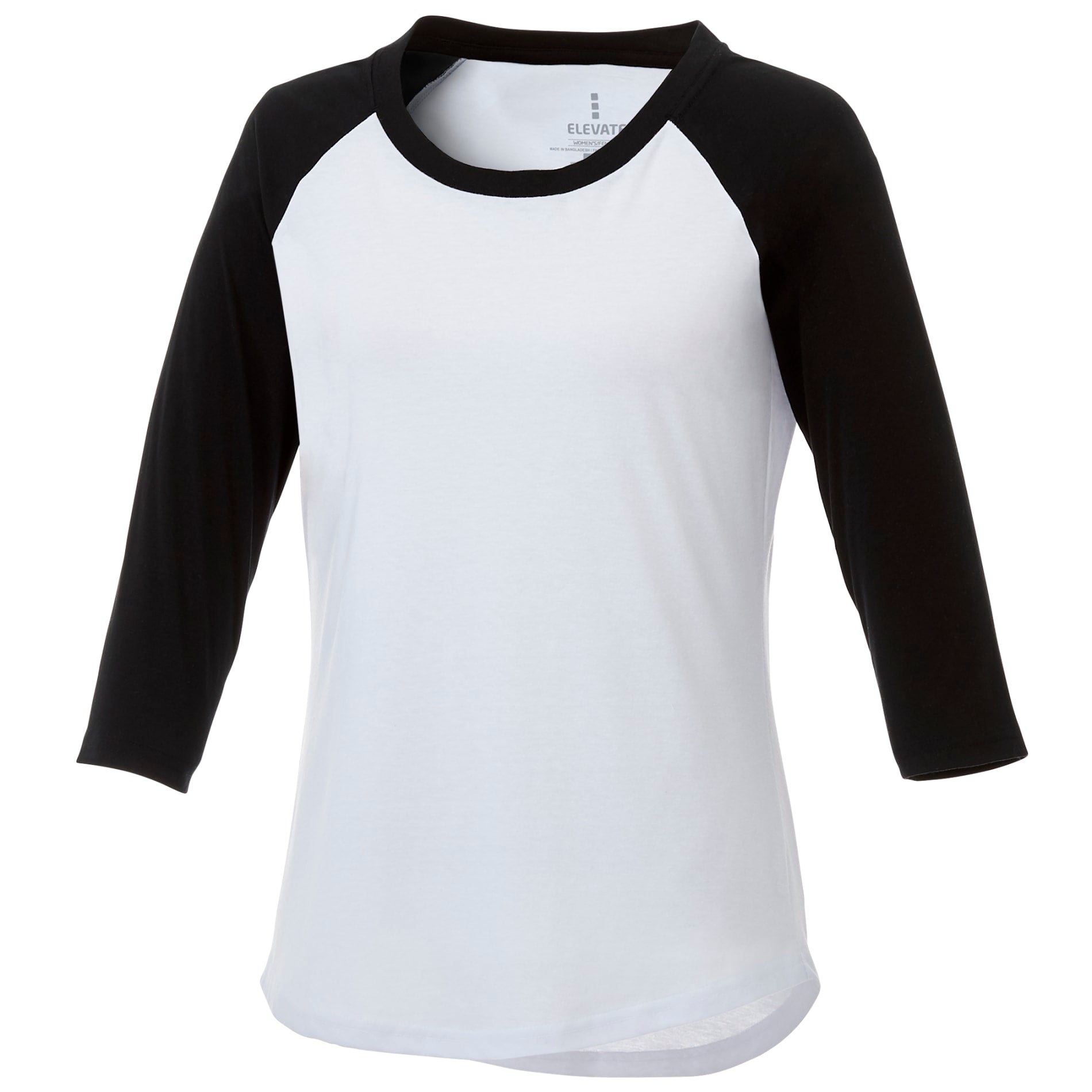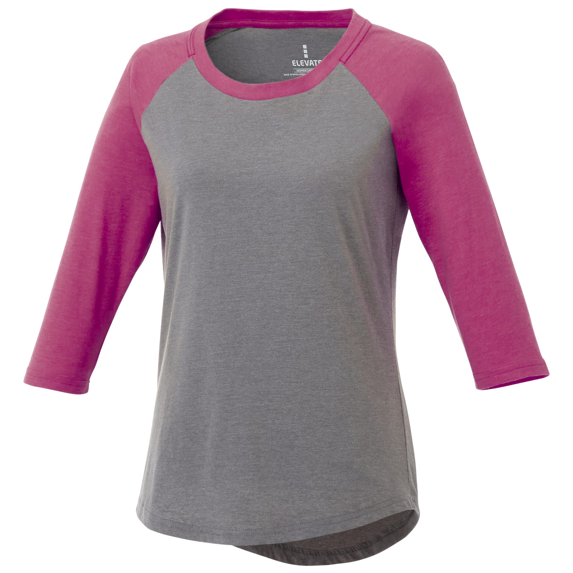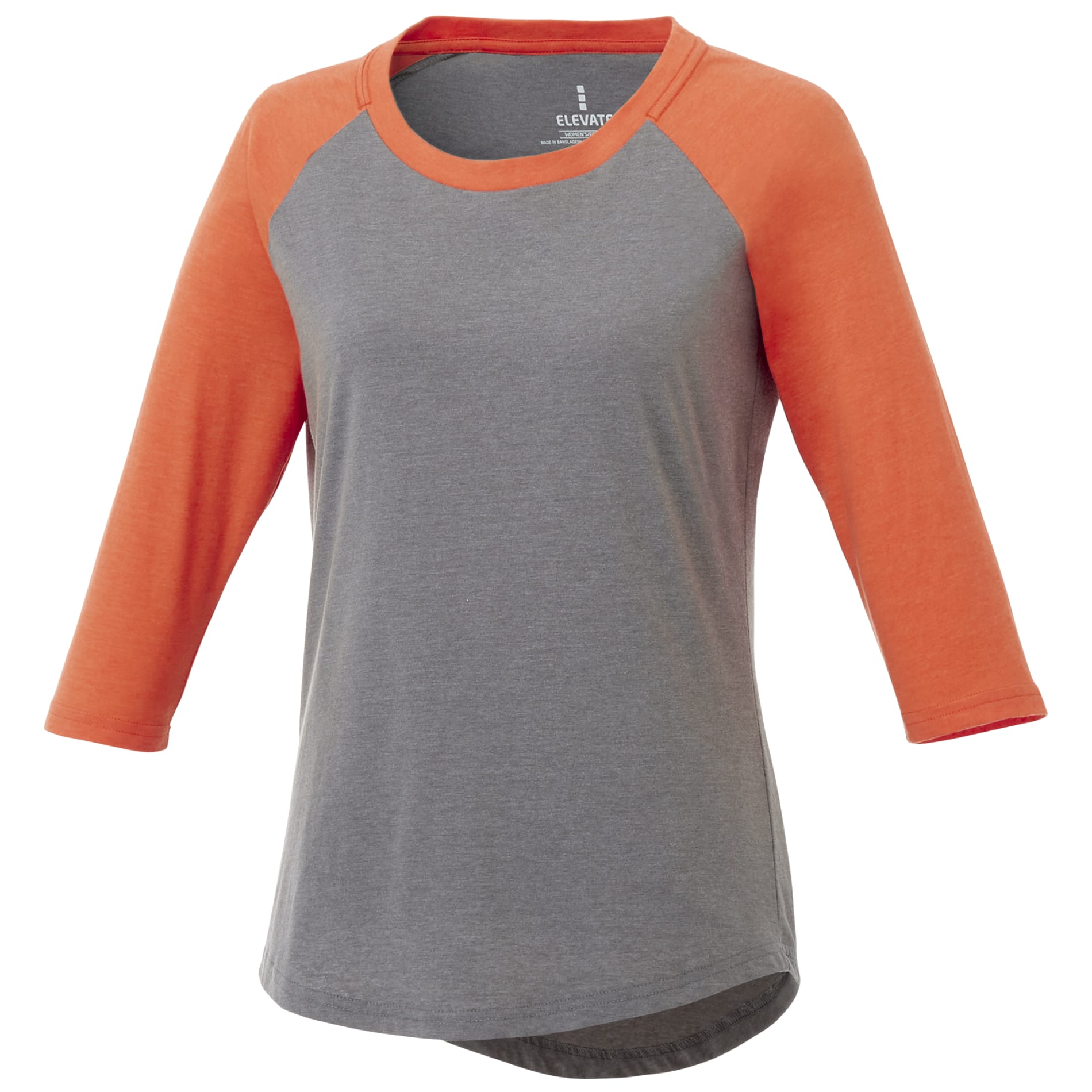 The ultra-soft Dakota Three-Quarter Tee is a cotton-poly blend thats compatible with our unique inFusion branding. Its got a classic sporty look, with a crew neck and rib knit collar. For women, the Dakota has a dropped back hem, shaped seams and a tapered waist. Made from the same insanely comfy fabric as the Bodie and Monroe tees.
