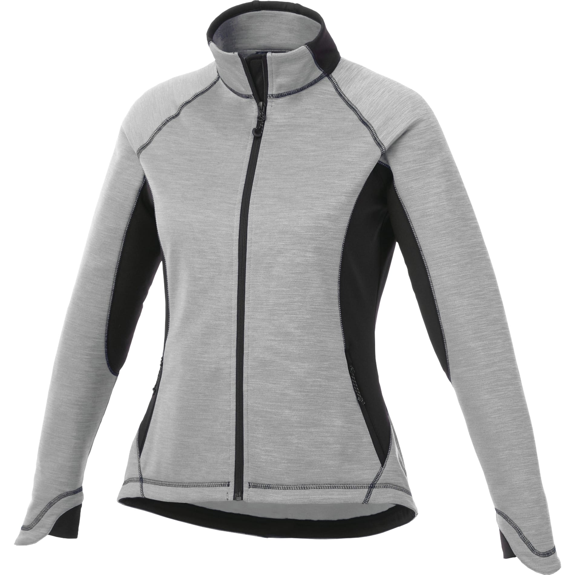 Looking sharp and staying warm will be easy to do this summer with our Langley Knit Jacket for women. Its constructed of 100% Polyester heather textured knit with a 94% Polyester, 6% Spandex interlock knit with brushed back. Features include an exposed #5 contrast reverse coil zipper, interior zipper flap, contoured cuffs and so much more. Available in four classic colour combinations to create that ideal understated brand expression.