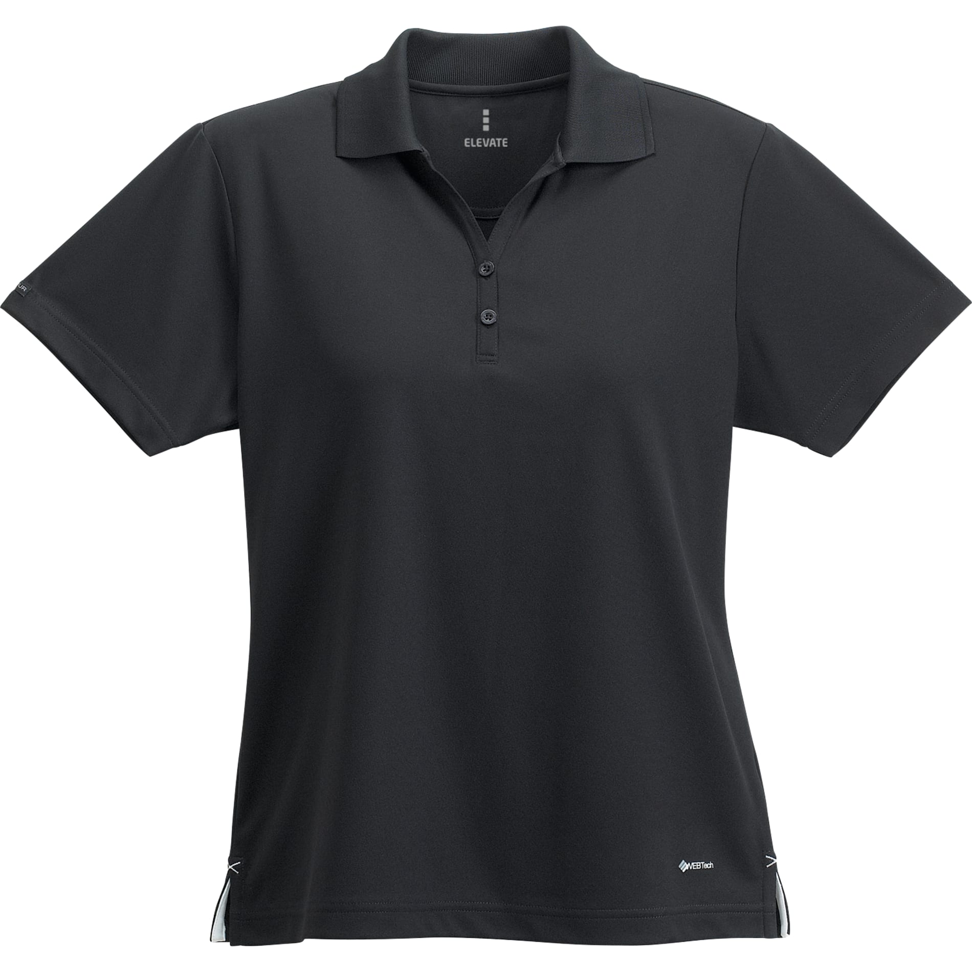 Advanced WEBTech; 100 wicking fabric offers breathable moisture management. Classic flat knit collar with long, slimming two-button placket (womens). Contrast X shaped bartacks at slits and taping on inside of slits. Laser not available on White.